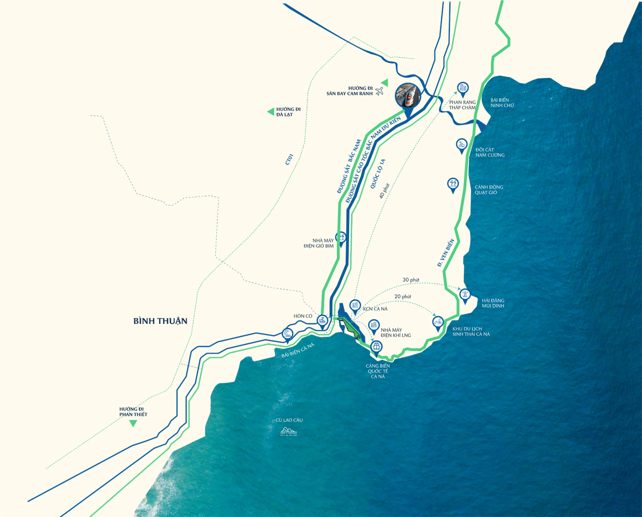 Trong vòng bán kính 3km từ dự án, các cụm cảng biển tổng hợp Cà Ná, Khu công nghiệp năng lượng tái tạo, kim khí đang hình thành và phát triển mạnh mẽ mở ra cơ hội giao thương quốc tế.